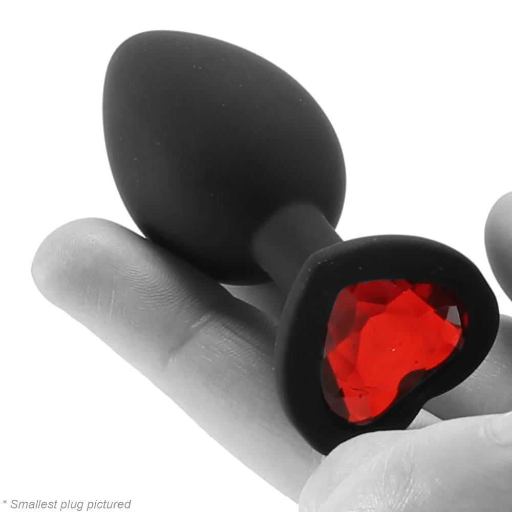 Inside, you’ll find three classically tapered plugs in black silicone. They’re each shaped for easy insertion, quick adjustments and removal, plus each features a sexy glittery heart at the base, but the similarities stop there. Size-wise, they’re very different, all the better to help you a) work up to or b) dive right into butt play bliss.Â