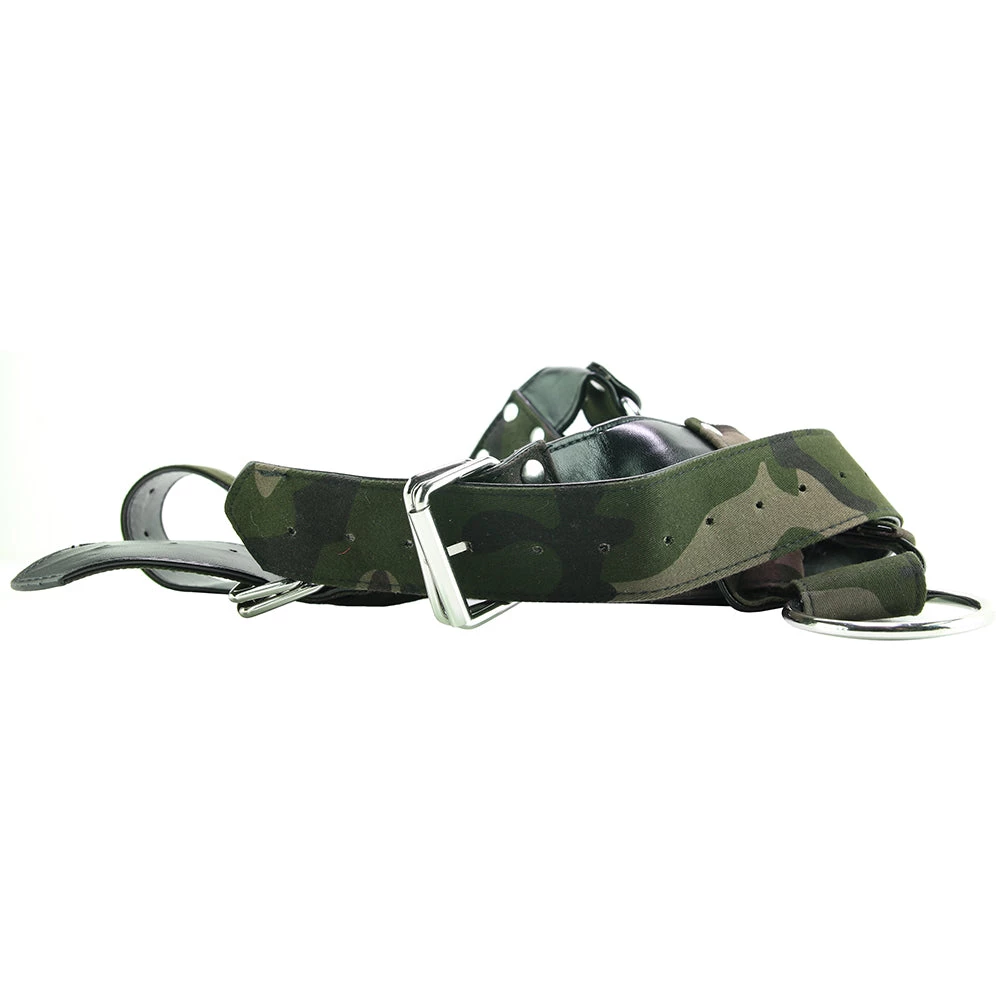 In sturdy camouflage canvas with a comfy faux leather lining, nickel-free non-tarnishing hardware and totally adjustable shoulder and under-arm straps, the Chest Harness will keep you/them under (consensual!) control. Two chrome O-rings in front and behind connect to just about any and all cuffs, collars, leashes, tethers and other bondage gear, plus, it looks super-hot!