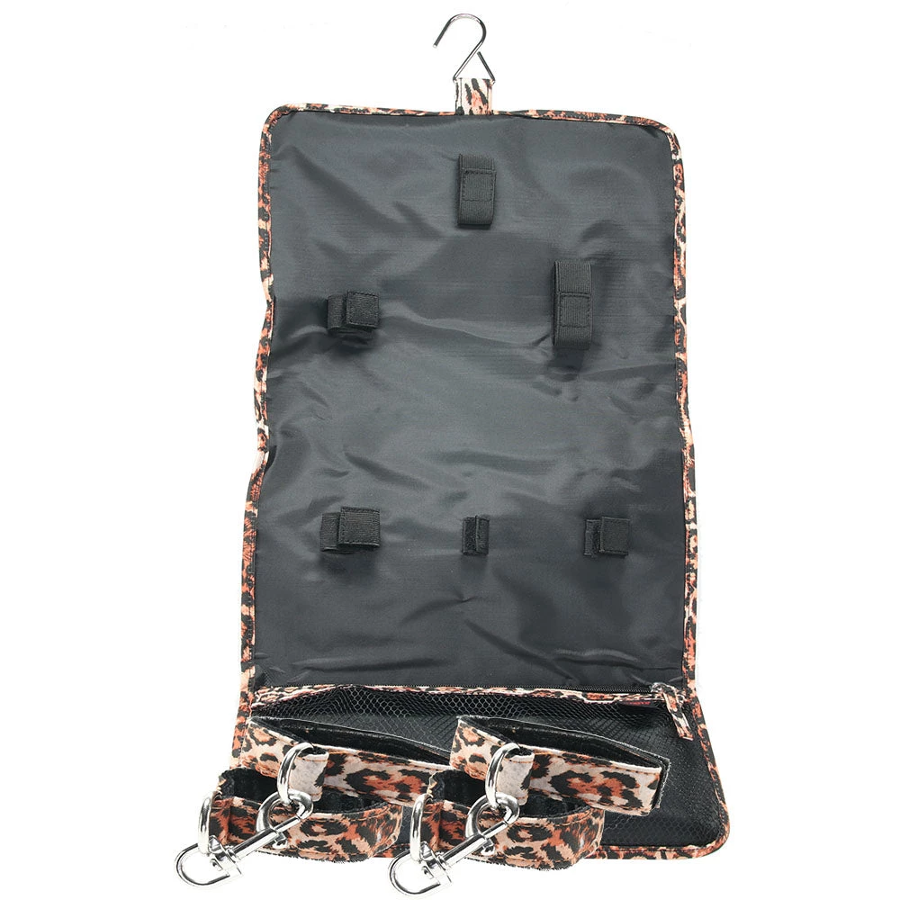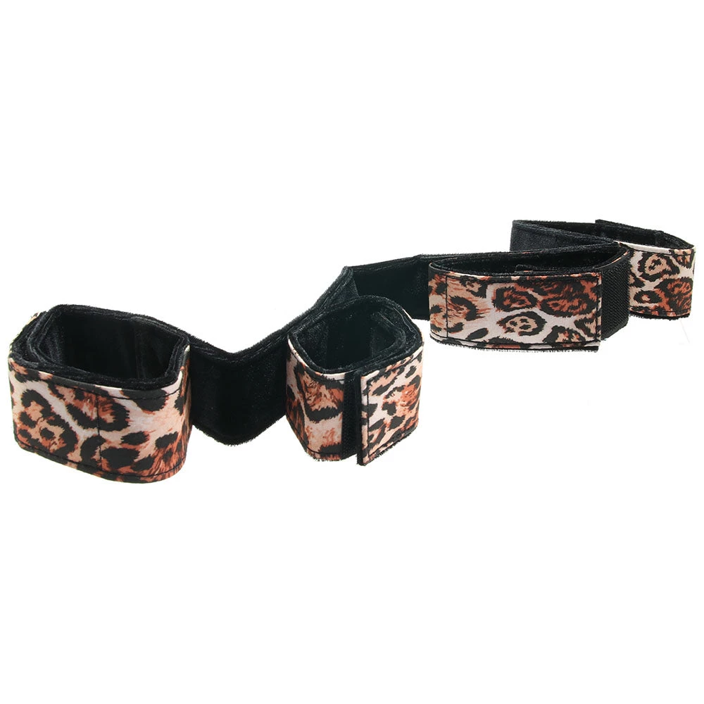 Inside a handsome black poly case trimmed in leopard print, you’ll find a perfect assembly of nine must-have bondage pieces, each fully capable of standing alone, but absolutely amazing when combined. Two silky leopard print ties can be used to restrain wrists or ankles, same goes for two sets of adjustable cuffs. There’s a breathable ball gag to try out if you’re feeling particularly adventurous, as well as a one-piece spreader bar with built in cuffs. A soft blindfold rounds off the Set.