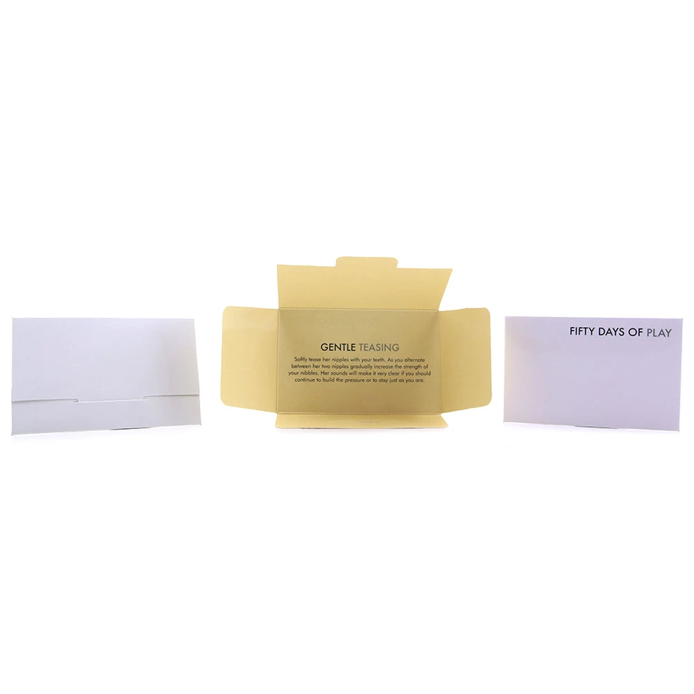 Explore uncharted territory with Fifty Days of Play from Creative Conceptions, a Fifty Shades of Grey-themed bedroom game that challenges couples with arousing gestures, scenarios, suggestions and surprises on a scale from vanilla to down right naughty. Including 50 ‘invitations’ to play that range from virginal white to seductive black, each player takes turns rolling the die to determine which color envelope to open. Roll a pink and you get to decide which shade you’d like to reveal. Upon opening the envelope, you’ll find a task at hand that indicates who will take the submissive and dominant roles, involving anything from light spanking to rougher, salacious play.Â
