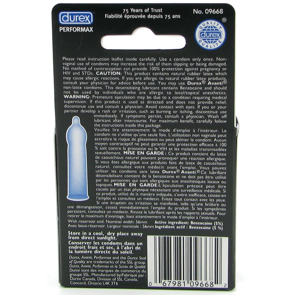 With over 75 years of experience, you could say that Durex has perfected the art of protection! Not only do Durex condoms protect against sexually transmitted infections and unplanned pregnancy; they’re also designed to enhance and improve your sex life. Performax condoms are specially designed to help make a good thing even better by helping you control climax. The comfortably fitted, reservoir-tipped shape is enhanced with a gently numbing, body heat activated climax control lubricant on the inside, and a silky, pleasing lube on the outside. Package contains 3.