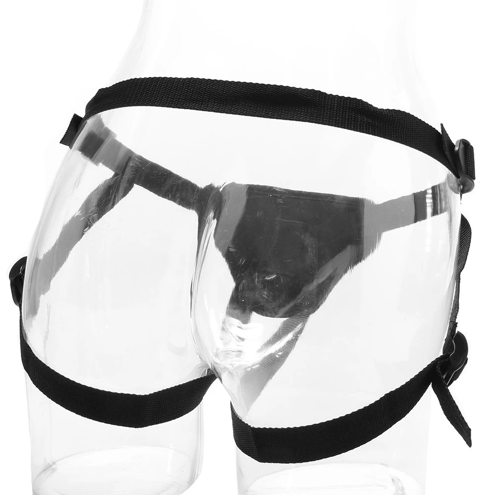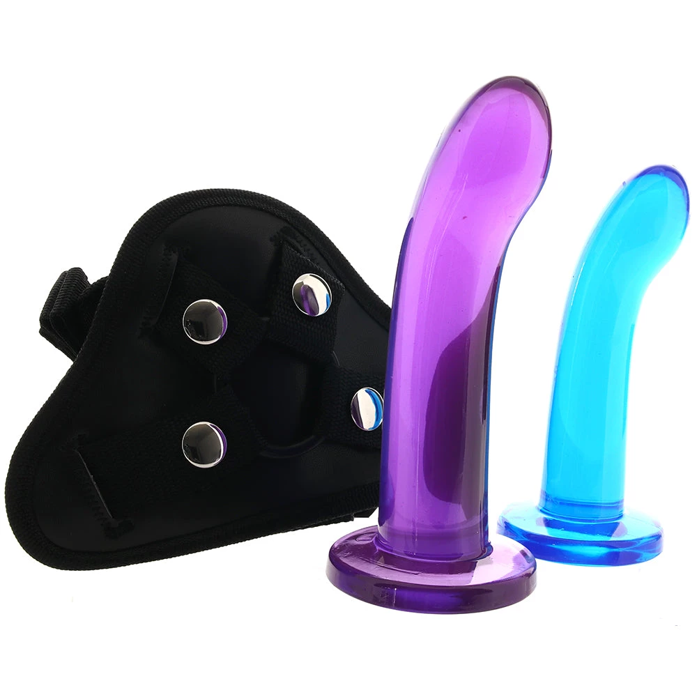 After you’ve slipped into the soft harness and adjusted the fit with easy-sliding straps, you’re ready to play. Attach the smaller blue or the larger purple dildo by slipping the flanged base through the snapped-in O-ring. The ring that comes pre-attached will fit either dildo, but if you’re in the mood for something even bigger or smaller, two more O-rings will fits bigger or more petite penetrators, too. O rings measure 1.25″, 1.5″ and 1.75″, respectively.