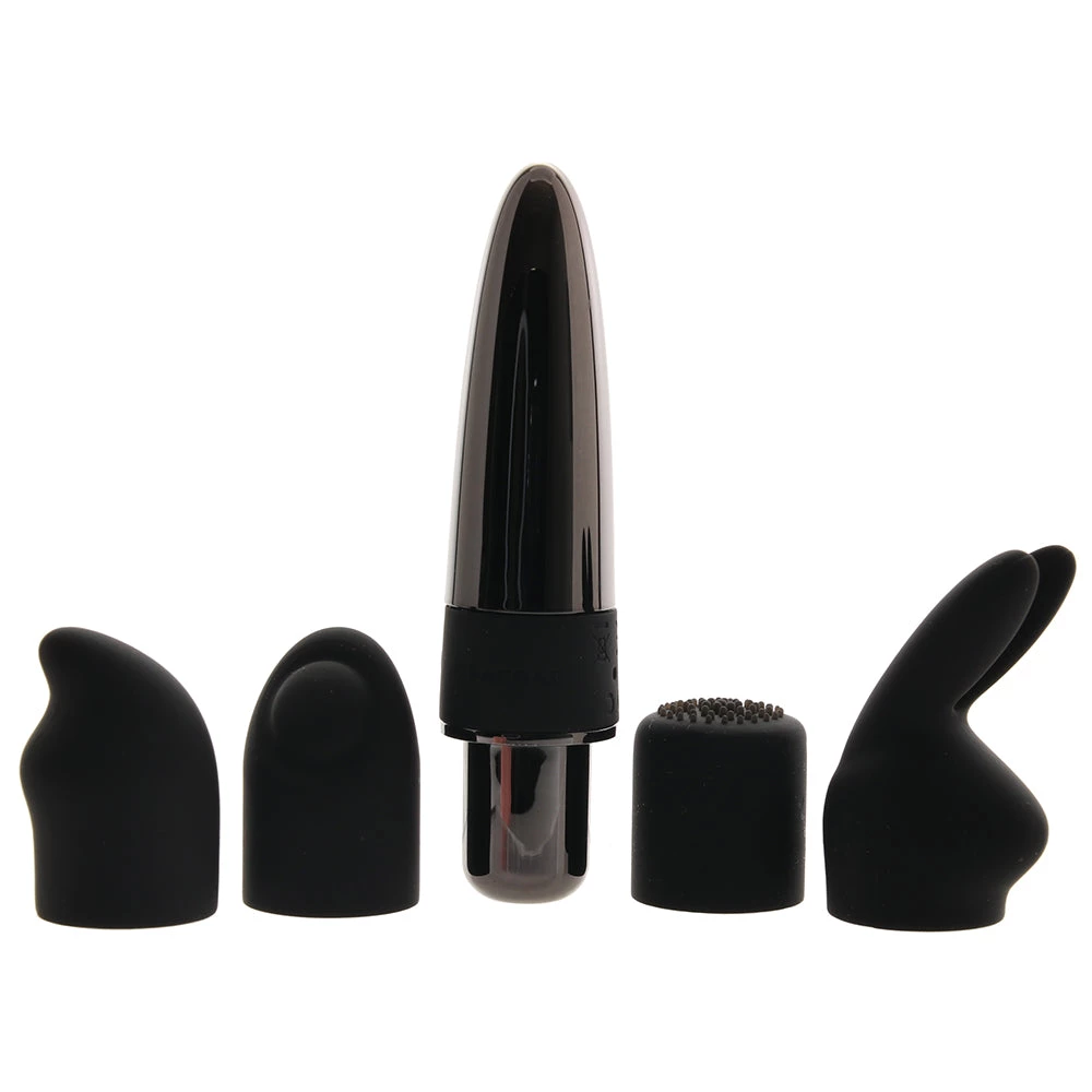 Let’s explore. First, you have a firm, sexily tapered mini vibe with seven possible speeds and rhythms of super-stimulating vibration. As if that weren’t enough, you’ll also find four completely unique silicone attachments that slip easily over the tip of the vibe. One is a flat, textured treat, one features tickly bunny ears, and the remaining two are softly pointed and strategically slanted and textured, respectively.