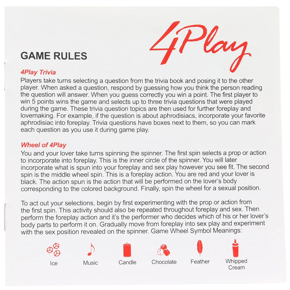 Inside the 4Play Game Set, you’ll find all that’s required to get nice and cozy in four very erotic ways. Games include Foreplay Fortune, Wheel of 4Play, 4Play dice and some super sexy 4Play Trivia. Full insturctions are included.Â