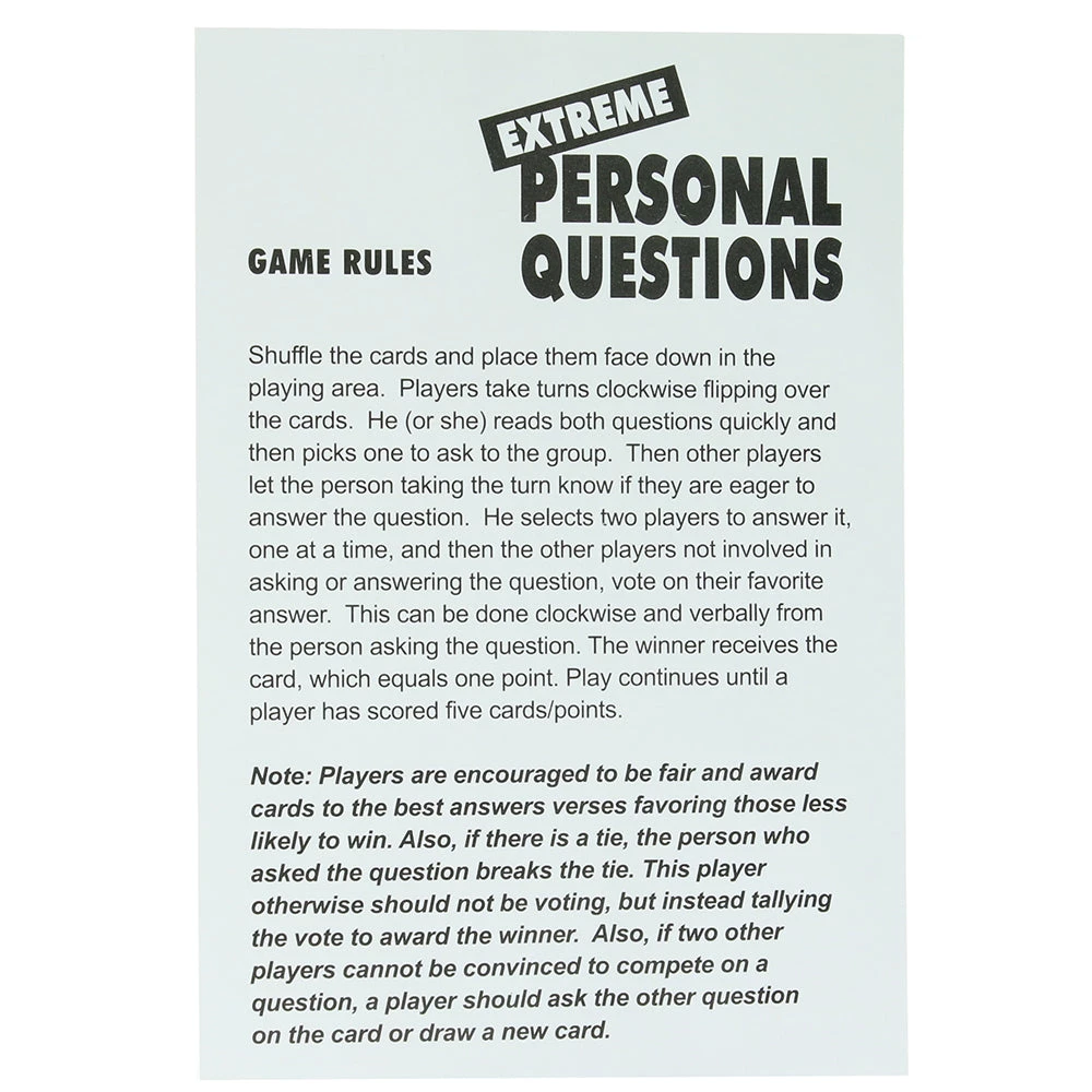 A sometimes raunchy, sometimes tame but always hilarious party activity perfect for friend groups or groups of people you’re okay with knowing wayyyy too much about, Extreme Personal Questions is a fairly uncivilized fun loving game of get-to-know-you.
