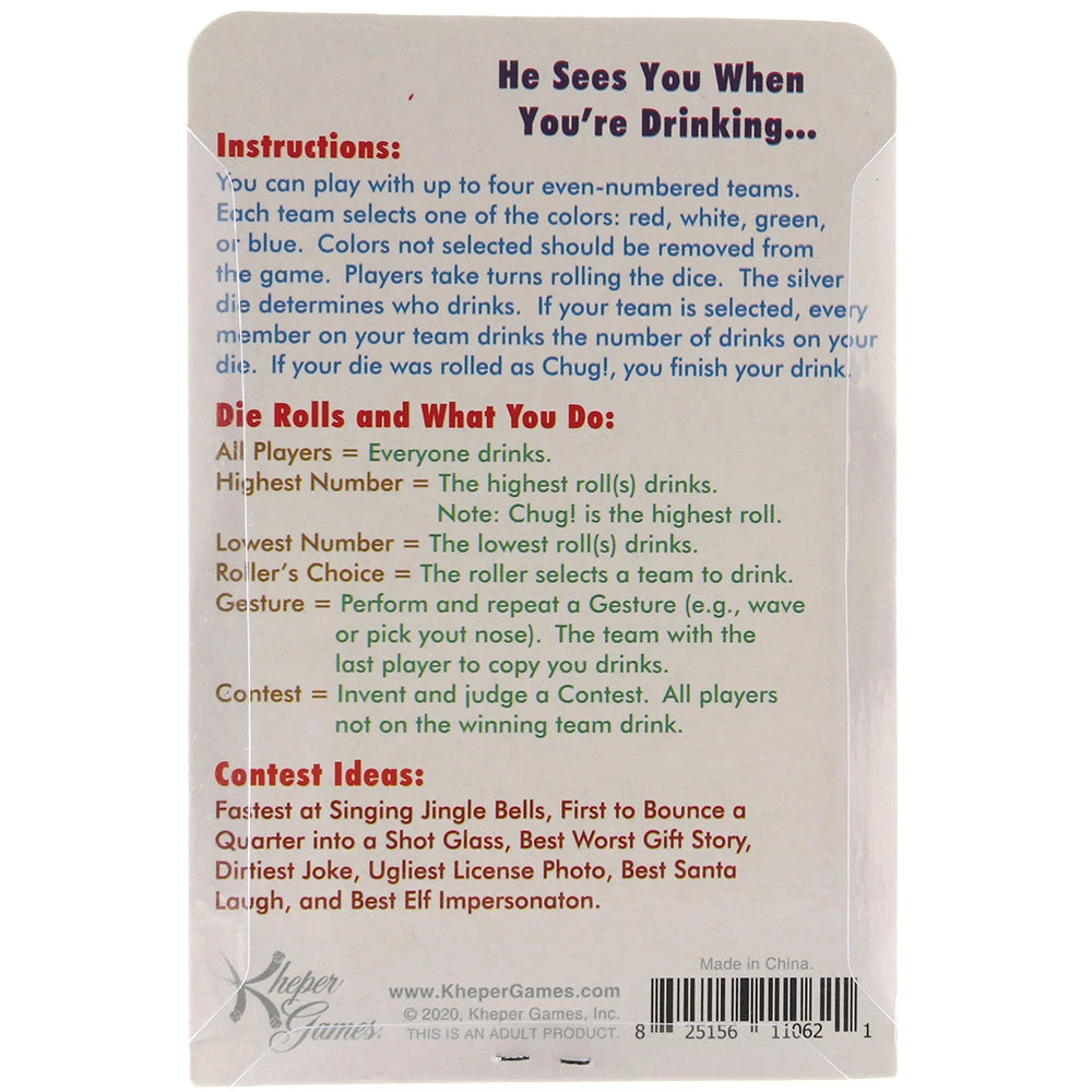 He Sees You When You’re Drinking is a simple game involving five dice, some drinks (yes, they can be boozy or not) and some friends. The dice will direct your actions, from straight-up drinking, to inventing and judging funny contests, to copying a roller’s gesture. Rules included.