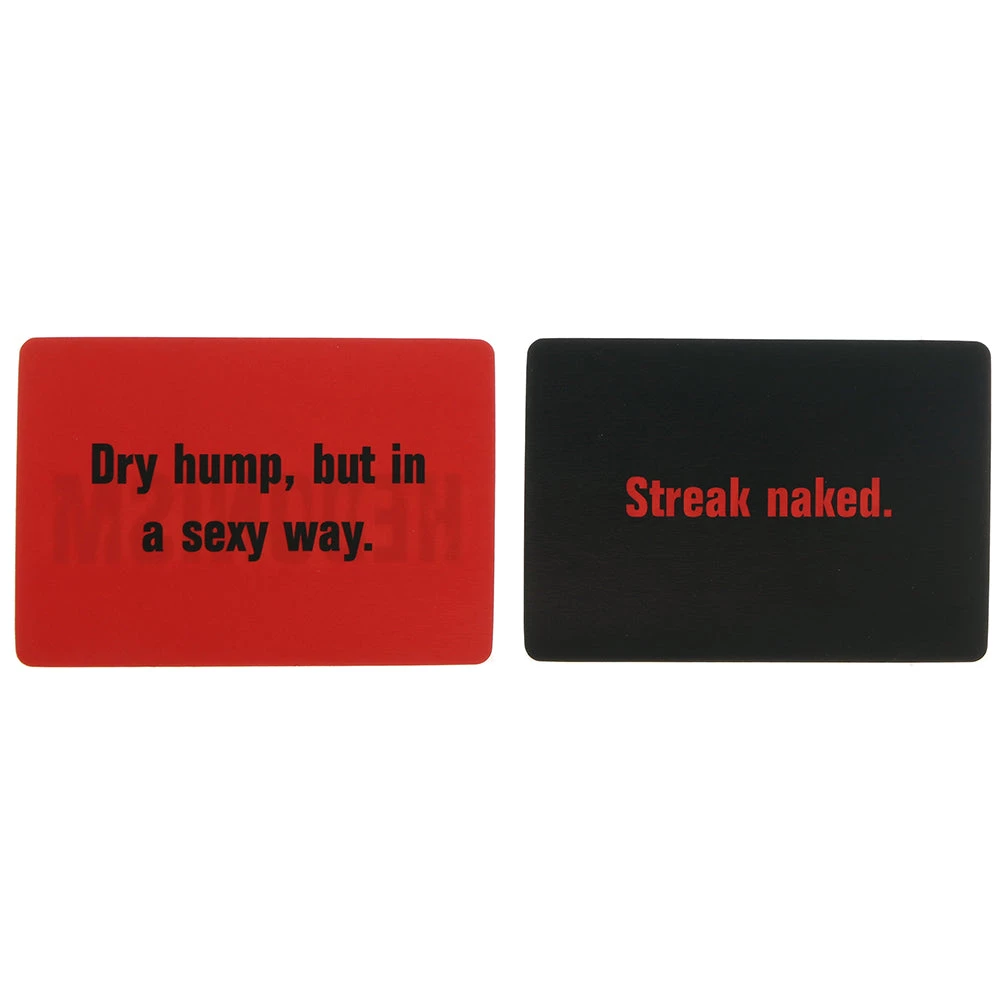 Flip the cards to reveal suggestions like “use ties to bind hands and then taunt sensually’ or ‘lick various erogenous zones for the next minute’ from the red deck and reveal things like ‘kiss someone in the weirdest way you can think of’ or ‘offer lap dances to the first person willing to tip you for one’ from the black.