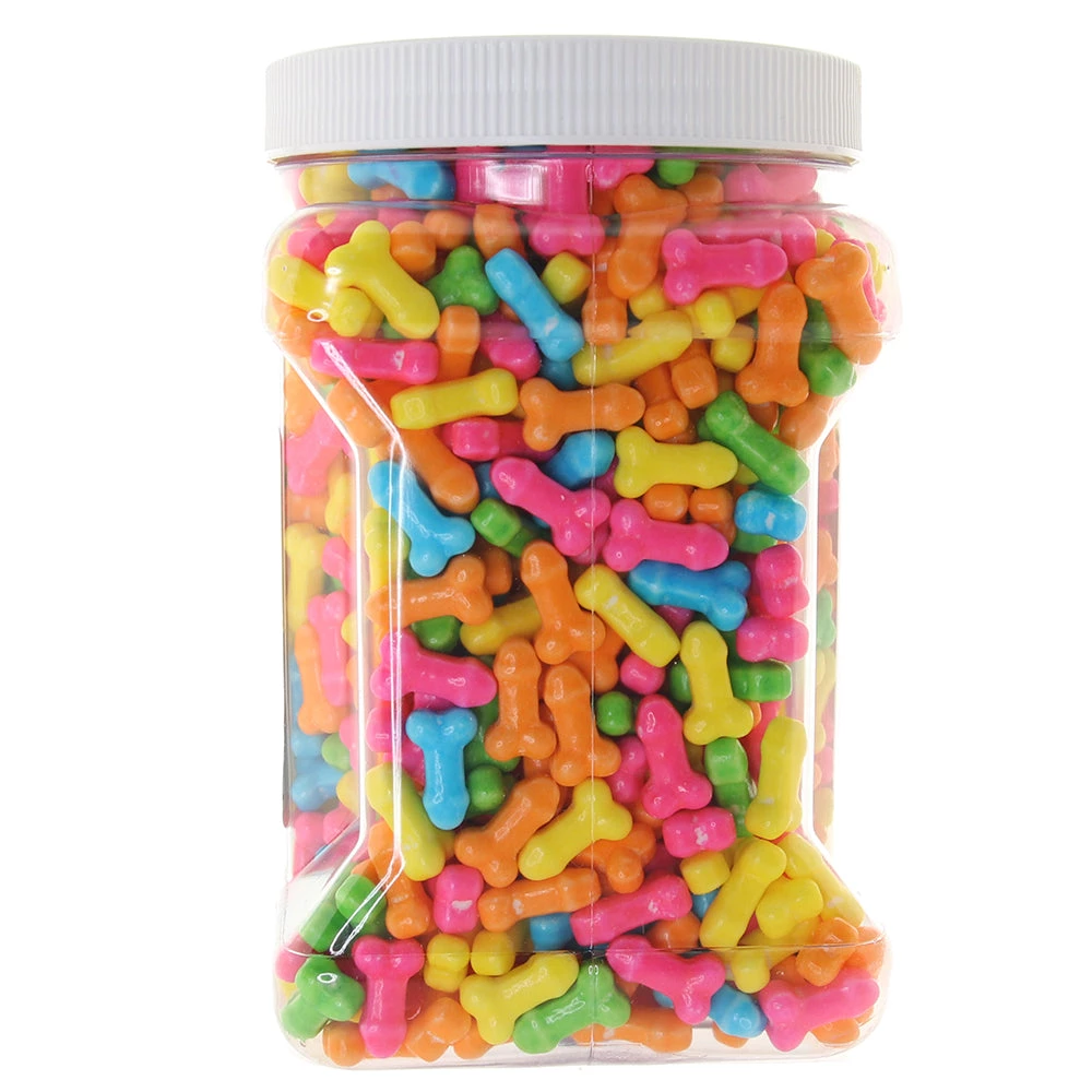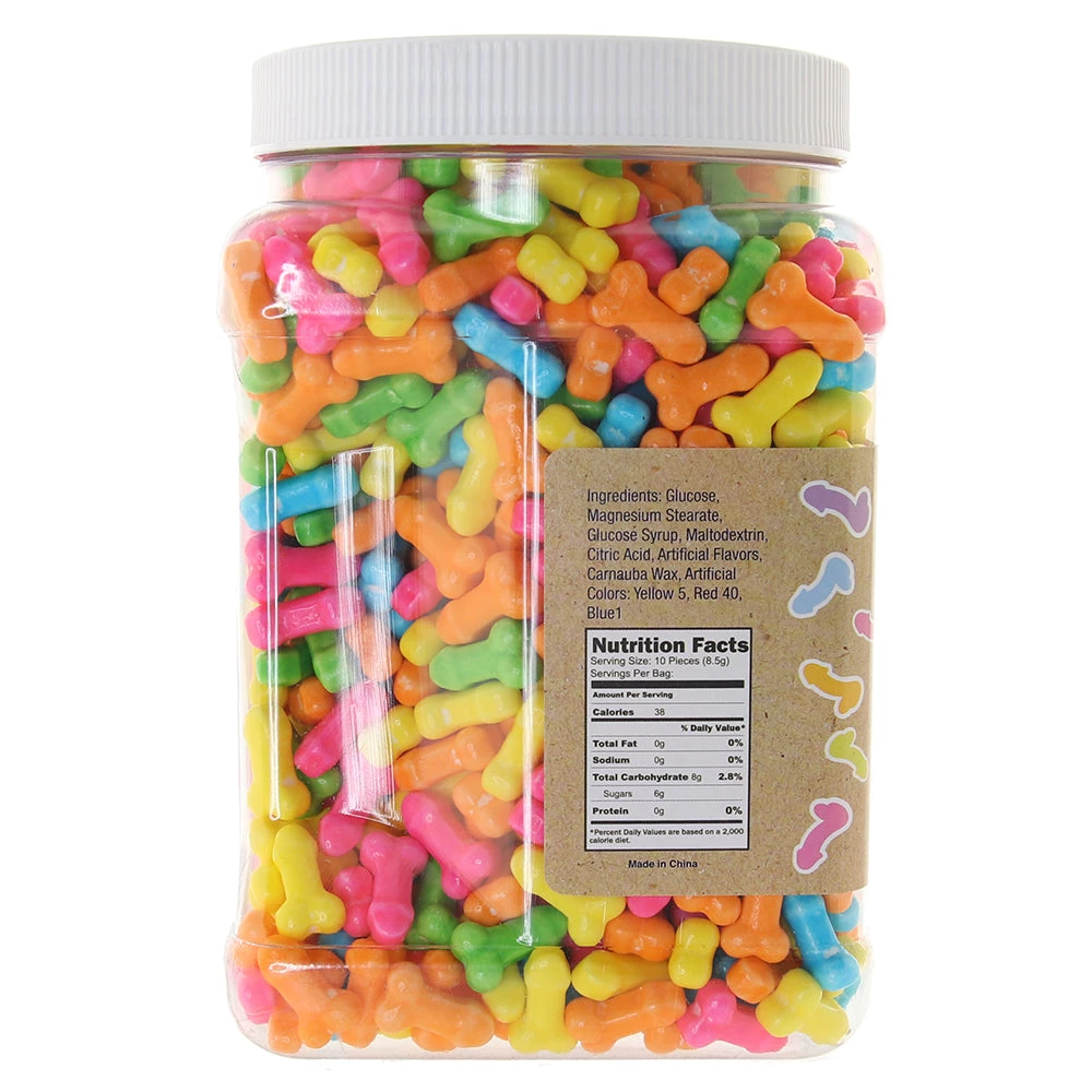 There are approximately 2lbs of candy dicks inside the colorful plastic jar – do with them as you will!