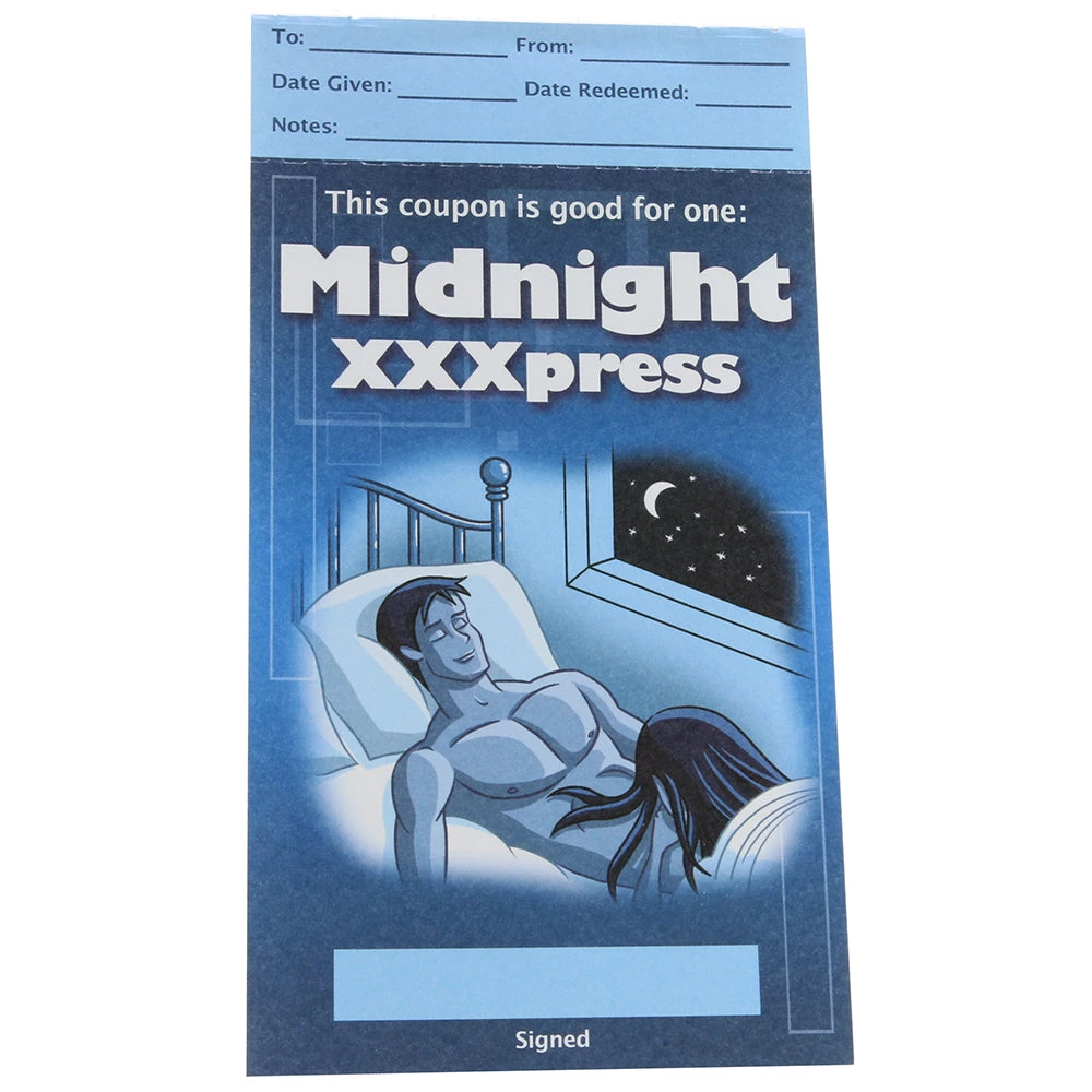 10 Pleasure Coupons For Him contains (yes, ten) colorfully and very cheekily illustrated vouchers redeemable for a playful erotic favor, from a Striptease to Wet Sex. Each coupon has space for the date, the recipients name, date received, a signature and notes. Very official!Â