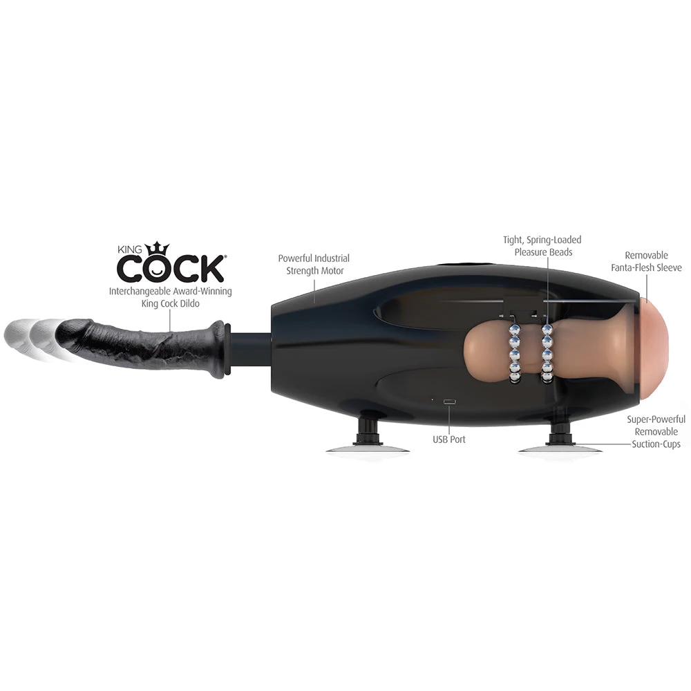 Simultaneously thrusting and stroking action for shared pleasure, a Japanese electric motor inside the Sex Machine’s lightweight ABS plastic body revs up with the touch of a button on the Machine or on a slimline wireless remote. 7 speeds combine forces with the lifelike feel of a choice of a 7 or 8 inch King Cock on one side and a super soft Extreme Pussy Stroker on the other.