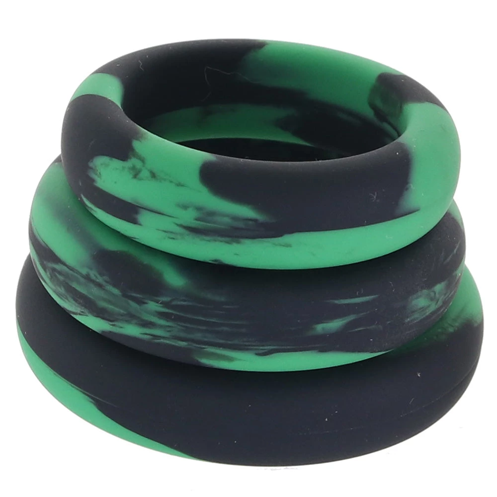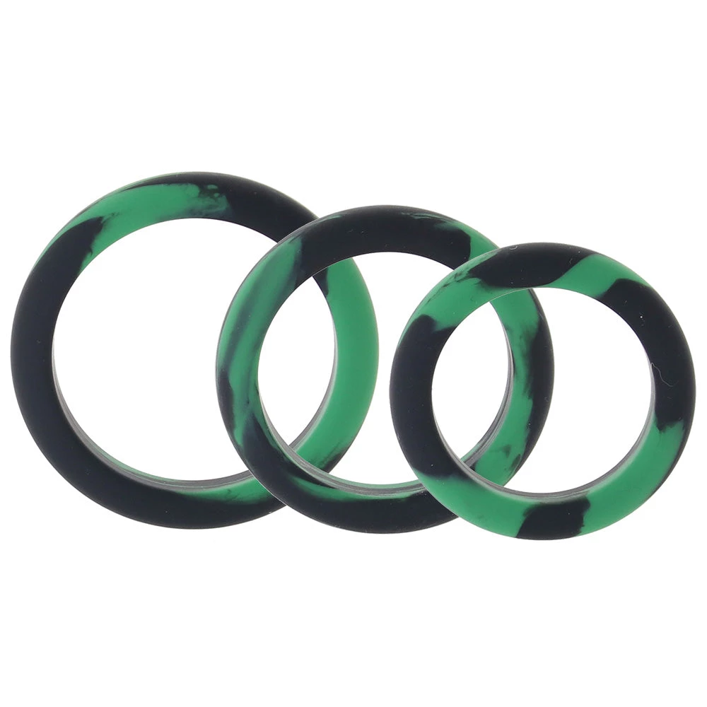 Whether you’re in need of some super-snug erection support, you’re looking to add a little extra texture and some strategic thickness to a favorite strap-on, or you’re just craving some silky, camo-print tension, the three piece Grip Me! Tension Ring Set has you (and possibly your partner) fully covered.