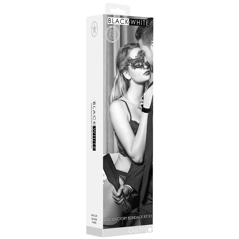 Open up the pretty packaging to find three deep black bondage mainstays; a pair of plushy faux fur-lined cuffs, a gorgeous masquerade-style Lace Mask, and a classic spank-ready paddle in black leather.Â