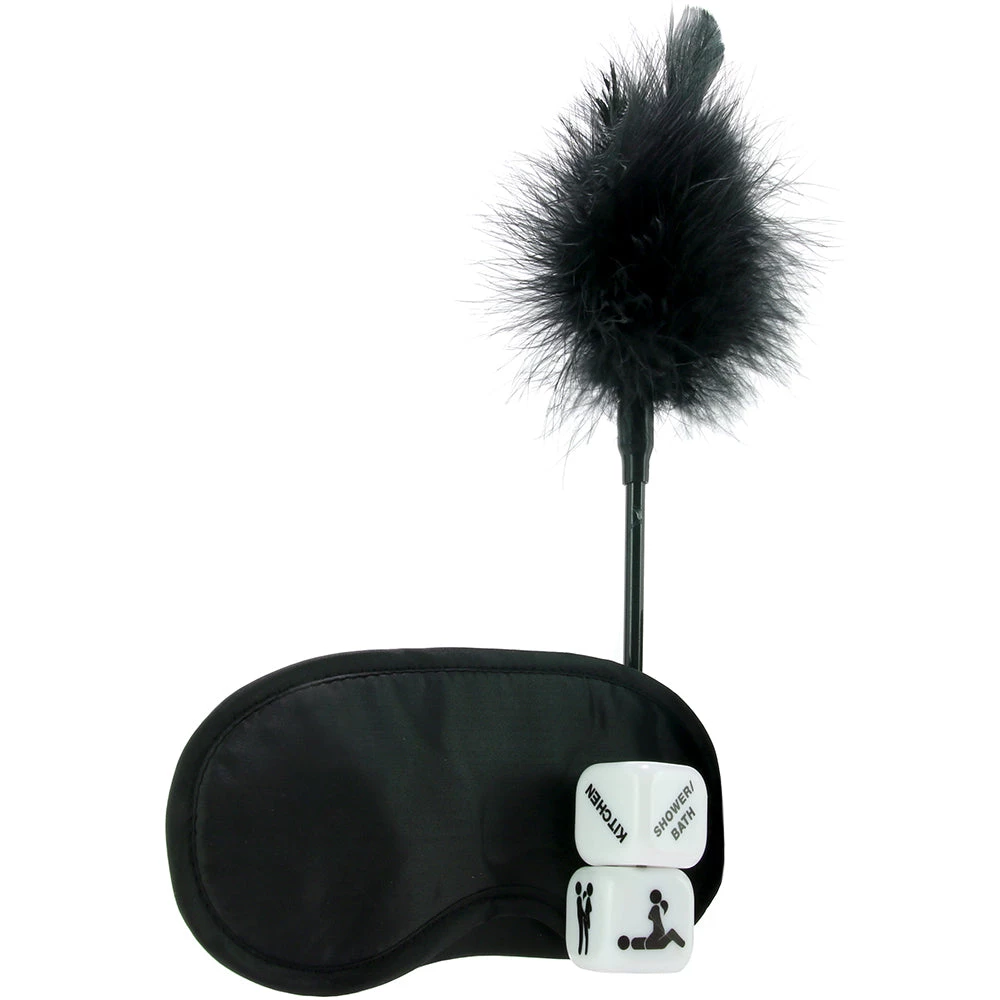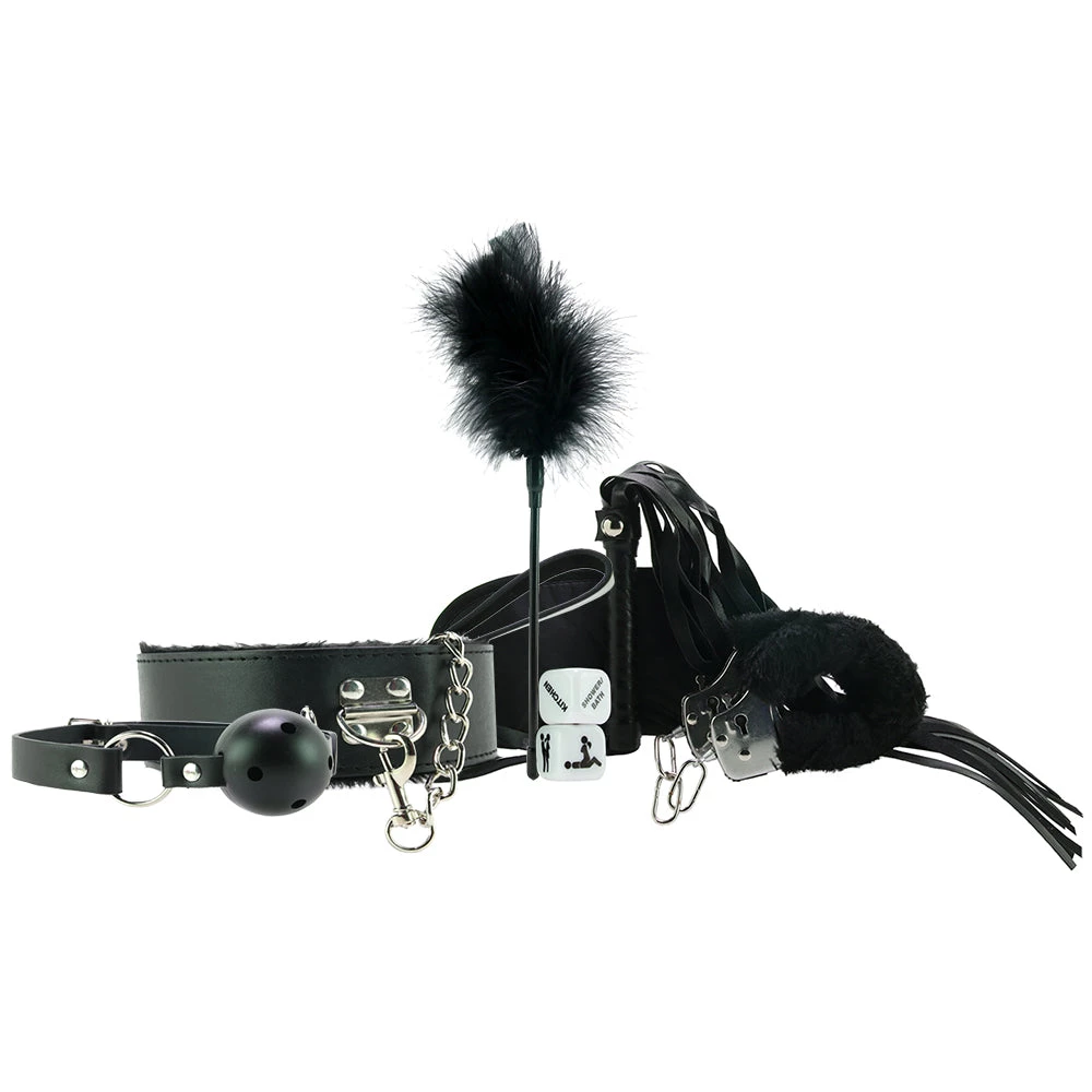 Open up the pretty packaging to find seven deep black bondage mainstays; a pair of faux fur lined cuffs, a lovely satin eye mask, a teasing feather tickler, a pair of very sexy dice and last but not least, a soft lined collar with matching chain leash.Â